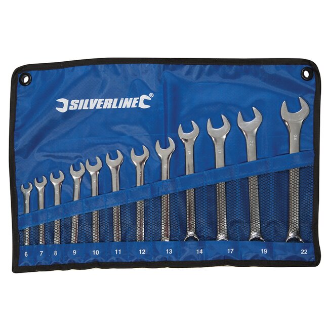 \r \rSilverline, Steekringsleutelset 12-delig 6 t/m 22 mm met 15° kop, Steek- en ringsleutels, chroom-vanadiumstaal, CR-V, 6 t/m 22 mm, 15° kop, dun profiel, gepolijste afwerking, nylon etui, handgereedschap, sleutelgereedschap, automontage, fietsen, sanitair, doe-het-zelf, professional