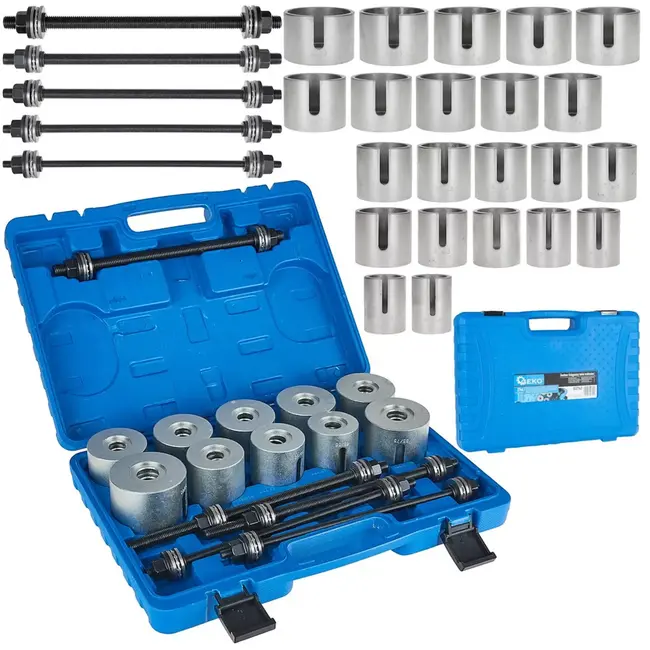 Professionele set voor het monteren en demonteren van bussen, lagers, lagerbussen en keerringen. Deze complete set geeft je de kracht en precisie om zonder schade en zonder hamer te werken. Ideaal voor werkzaamheden aan ophanging en lagerhuizen, met een brede maatdekking en verpakt in een handige koffer zodat je overal georganiseerd en efficiënt aan de slag kunt.