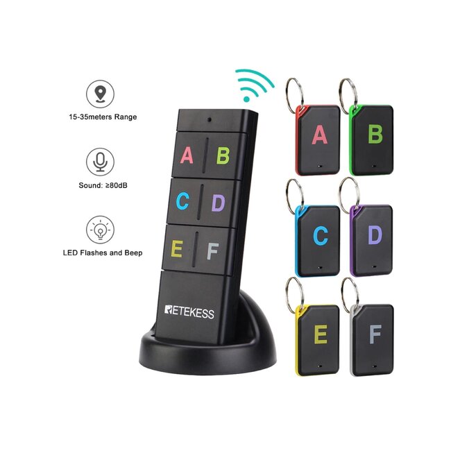 Nooit meer zoeken: Retekess sleutelvinder met 6 ontvangers. 15–35 m bereik, 80 dB geluid, knipperend en trillend signaal. Vind je sleutels snel terug. Lees meer.
