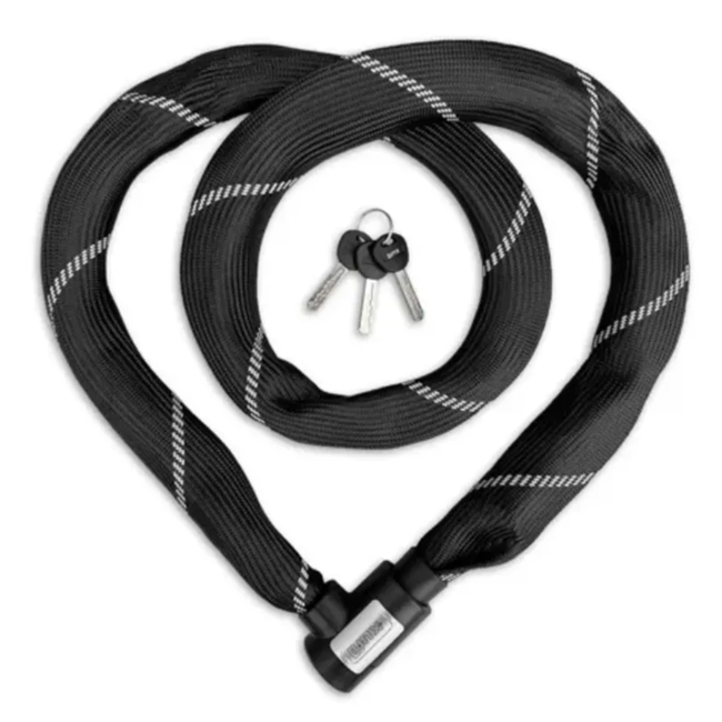Om het fietsframe te beschermen tegen krassen, zijn de schakels omhuld met een flexibele mesh hoes. Deze hoes voorkomt niet alleen beschadigingen, maar geeft het slot ook een moderne uitstraling.