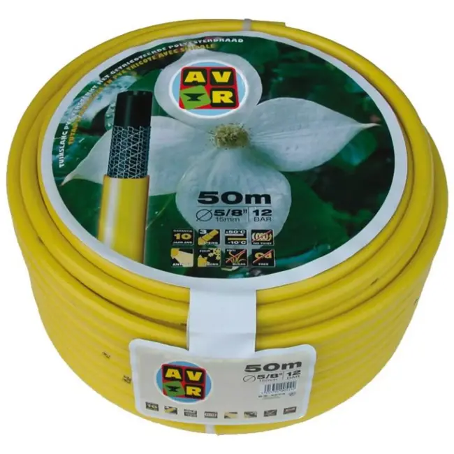 Zoekwoorden: AVR, gele tuinslang, 3/4 inch, 100 meter, getricoteerd, high twist resistant, UV-bestendig, anti-algen, tuinaccessoires, waterverplaatsing, duurzame tuinslang.