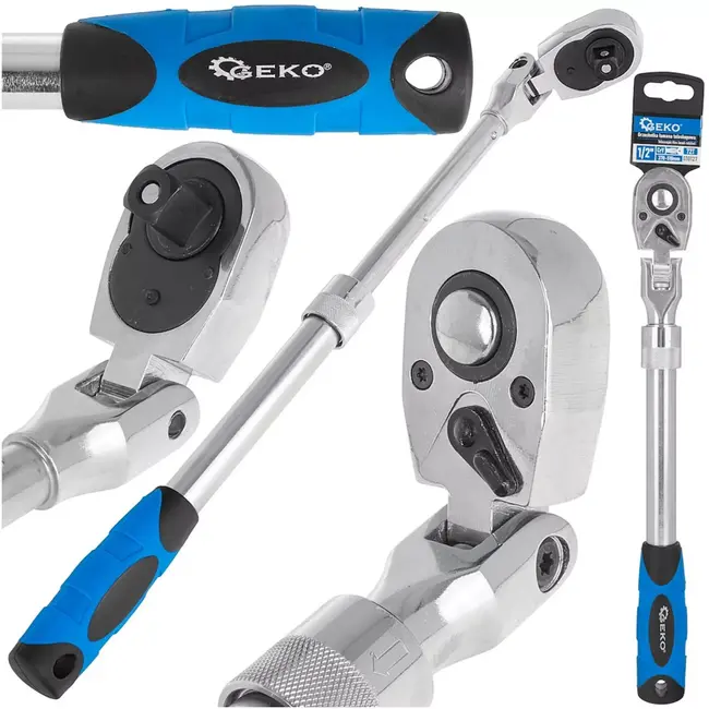 GEKO telescoopratel 370–510 mm met knikbare kop en 12,5 mm vierkant. 72-tands voor fijne slag en meer kracht, CrV-staal, ergonomische antislip greep. Lees meer.