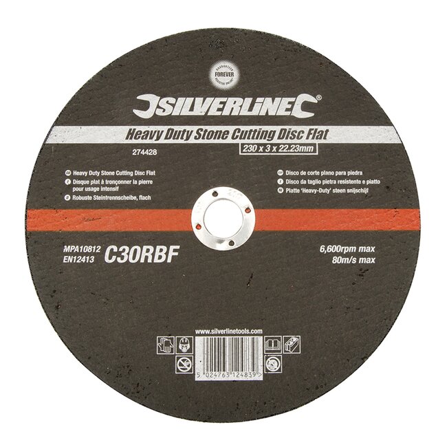 Silverline snijschijf Ø 230 x 3 mm: glasvezel versterkt voor snel, veilig snijden van steen en tegels. Past op elke haakse slijpmachine. EN12413 gecertificeerd. Lees meer.