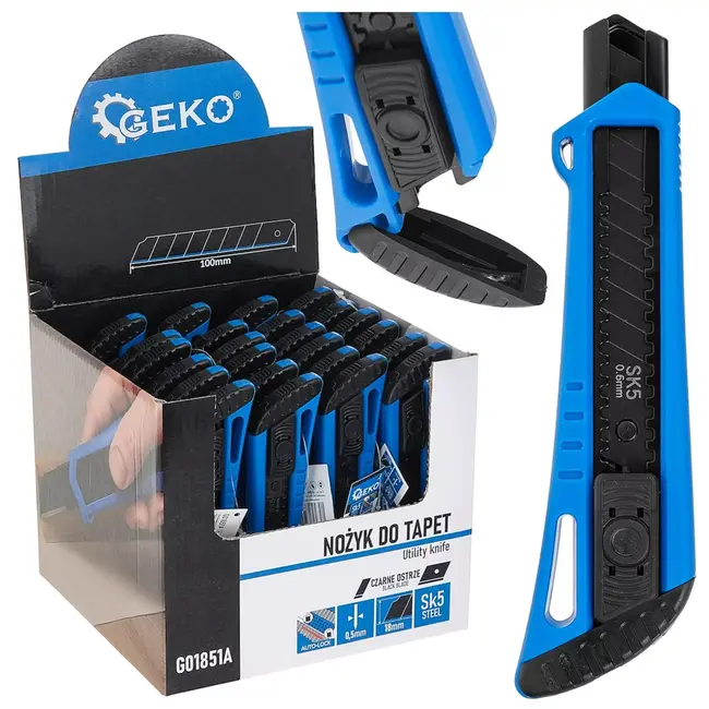GEKO, behangmes 18 mm, behangmes, afbreekmes, snijmes, segmentmes, SK5-staal, automatische vergrendeling, ergonomische greep, antislip, precisie snijden, behang snijden, karton snijden, folie snijden, doe-het-zelf, professioneel gereedschap, displaydoos 24 stuks
