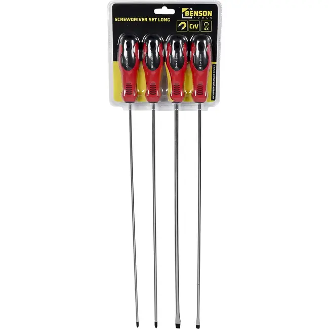 Schroevendraaier set 4-delig lang, met handvat, Benson, Benson schroevendraaier, Benson Schroevendraaier set 4-delig lang, schroevendraaier, handig voor moeilijk bereikbare plaatsen, schroevendraaier handig voor moeilijk bereikbare plaatsen, Benson schroevendraaier handig voor moeilijk bereikbare plaatsen, schroevendraaier met handvat, Benson met handvat