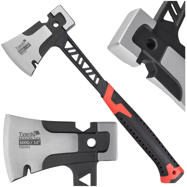 Tvardy, bijl-hamer 600 g, handgereedschap, monoblok, anti-schok handgreep, bijl en hamer in één, 36 cm, antislip greep, hout hakken, klussen, bouw, sloop, kamperen, tuinwerk, hamerkop, scherpe snede
