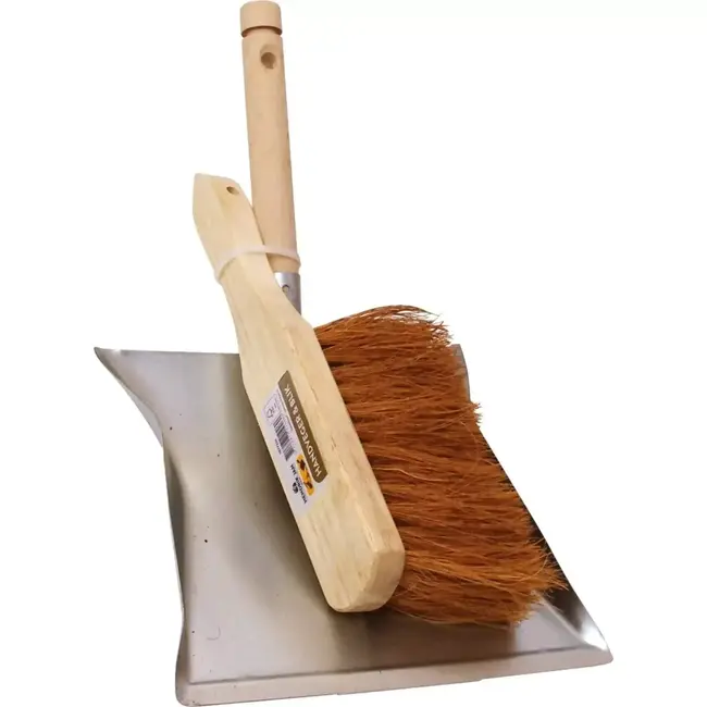 stoffer en blik, stoffer en blik set, stofblik met steel, zinken stofblik, handveger kokos, kokos natuurvezel, houten handveger, tuin schoonmaken, schuur schoonmaken, stoffer blik met trekband, fsc schoonmaakset