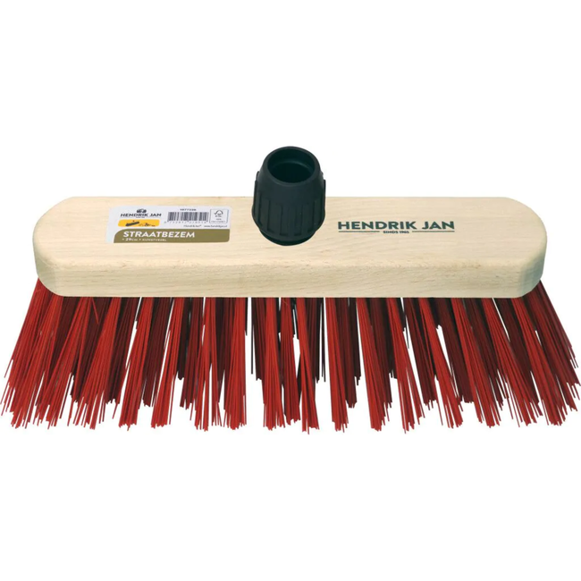 Straatbezem 29 cm met harde rode kunstvezels en steelhouder. Ideaal voor grof vuil, betonresten, bouwafval en sneeuw op stoep, erf en oprit. Lees meer.