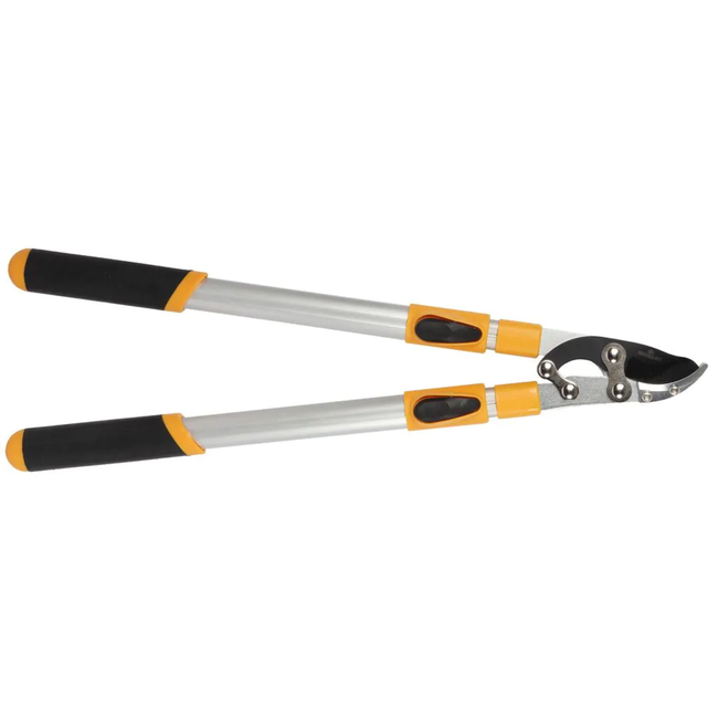 Ontdek de Telescopische takkenschaar met aambeeld en antikleefmes, verstelbaar van 67 tot 100 cm Lichtgewicht telescopische takkenschaar met aambeeld, antikleefmes en aluminium armen. Verstelbaar tot 100 cm en knipt boomtakken tot 34 mm dik.