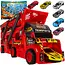 De vrachtwagen is gemaakt van stevig kunststof en metaal, waardoor hij bestand is tegen intensief spelen. De drie niveaus van de oplegger bieden voldoende ruimte om alle zes de auto’s veilig op te bergen. Met de kleurrijke stickers en dynamische prints krijgt het geheel een sportieve uitstraling. De meegeleverde metalen auto’s hebben realistische details en zijn leuk om te verzamelen of te gebruiken in racespellen.