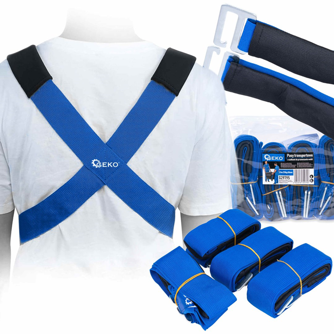 Til en verplaats zware meubels een stuk stabieler en met meer controle. Deze GEKO draagriemen met harnas zijn bedoeld voor het verplaatsen van grote en onhandige spullen zoals kasten, koelkasten, wasmachines, banken en boekenkasten. Je gebruikt de riemen als een draaghulp met schouder of arm ondersteuning, zodat het gewicht beter verdeeld wordt en je minder hoeft te worstelen in smalle gangen, bij drempels of op de trap. Ideaal als je gaat verhuizen, regelmatig meubels verzet of gewoon zonder gedoe een zwaar apparaat op zijn plek wilt krijgen.