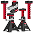 Deze set bestaat uit 2 stuks, ideaal om links en rechts te ondersteunen. Of je nu af en toe zelf sleutelt of regelmatig aan voertuigen werkt, je merkt het verschil zodra je sneller de juiste hoogte hebt ingesteld en je de stand met borging vastzet. Minder gedoe, meer controle, en je werkplek voelt direct netter en veiliger georganiseerd.